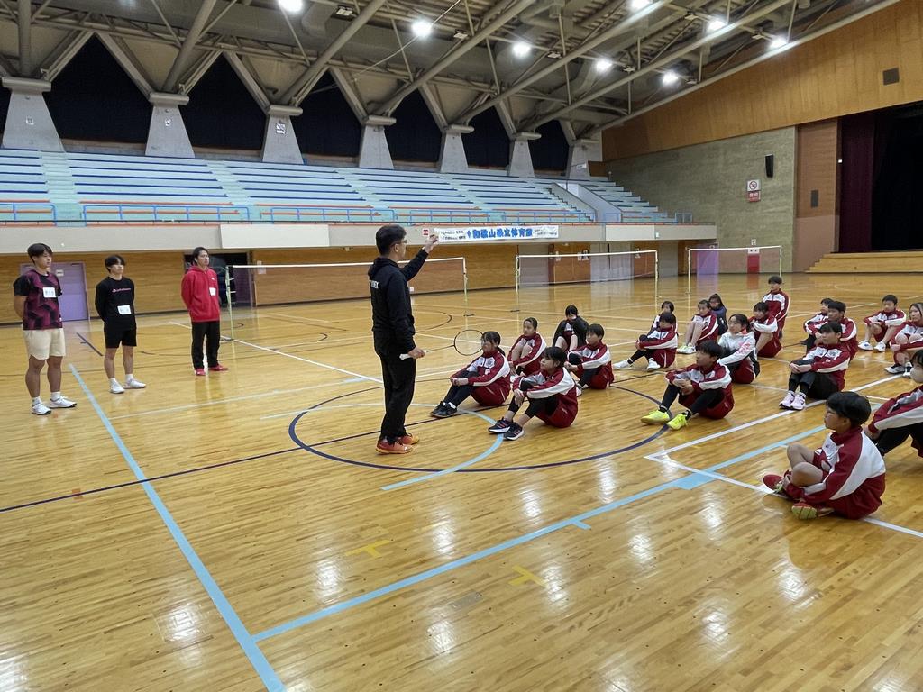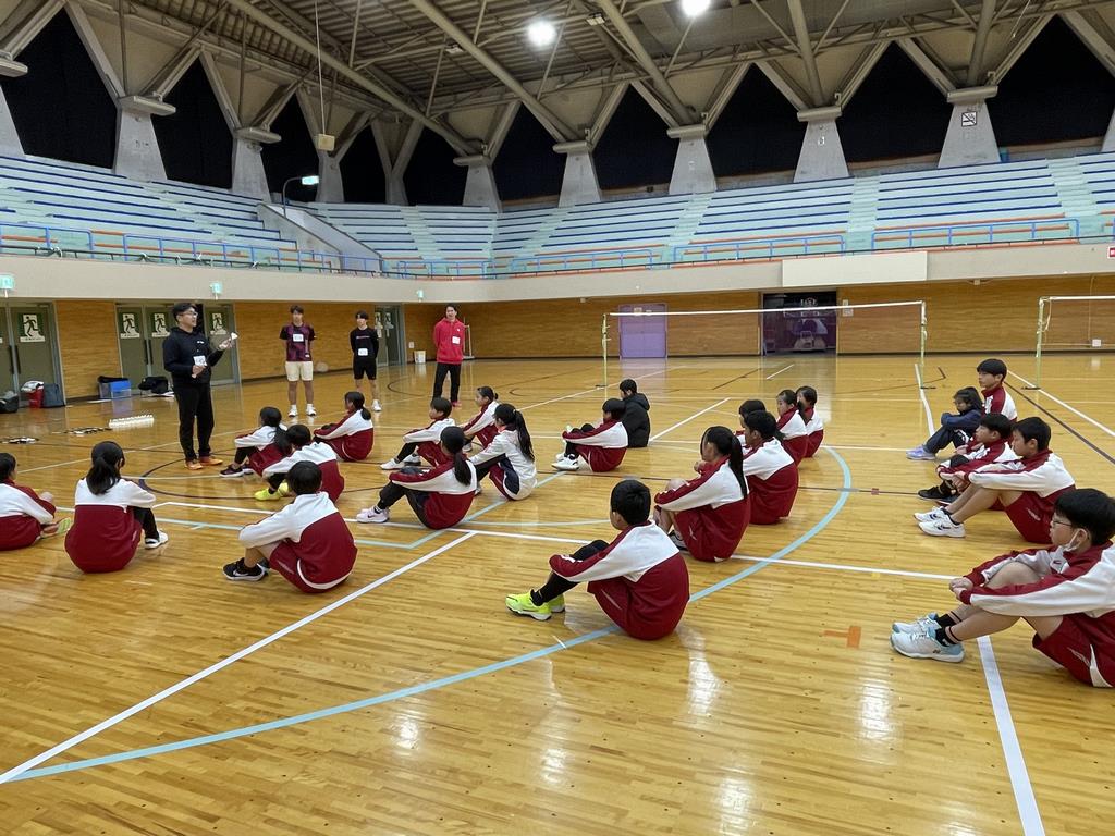 指導者の方々が、スマッシュ・ヘアピン・ドライブ・クリアなどの見本を見せてくださいました。子どもたちはシャトルの速さやテクニックに驚いていました。