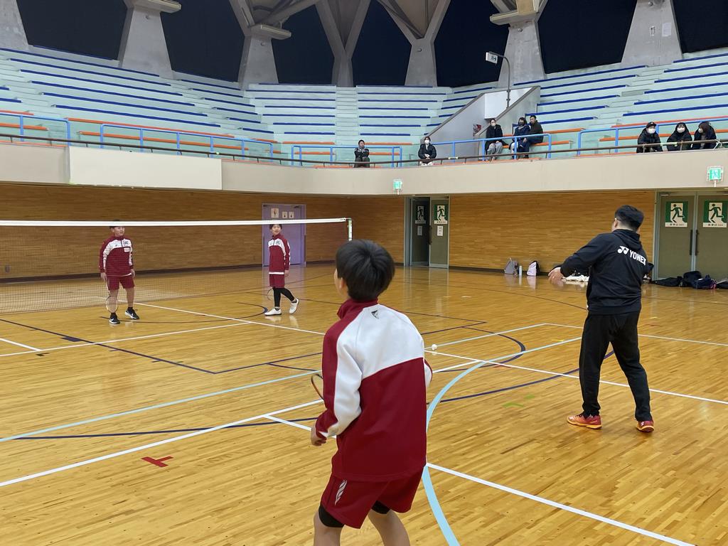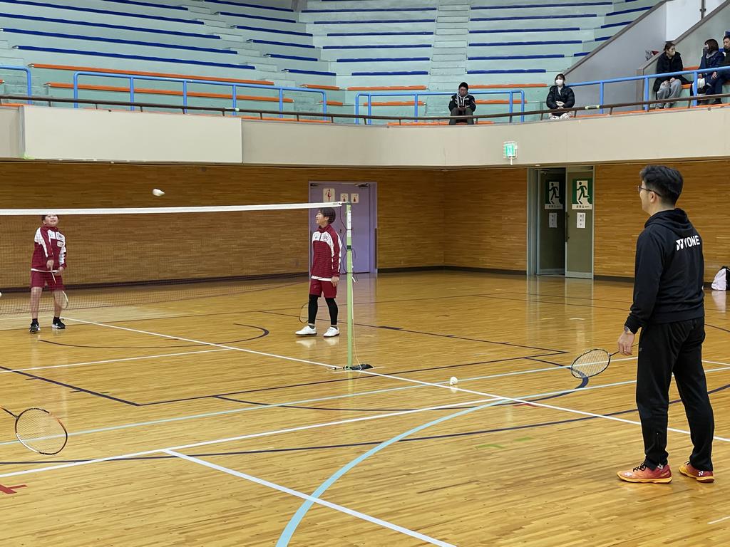 ラケットの握り方や操作、基本的な打ち方を教わったあと、シングルスやダブルスの試合を行いました。学んだドライブやヘアピンを試す姿が見られ、先生にも積極的に挑戦していました。