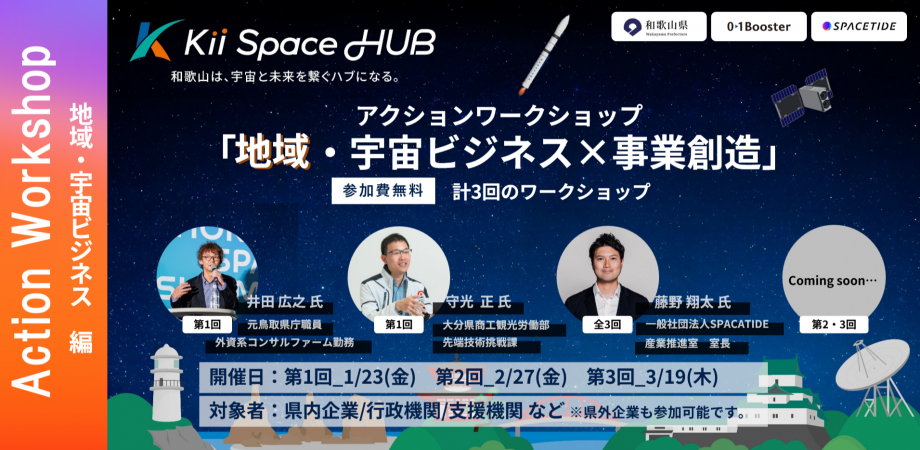 第1回は「鳥取・大分から学ぶ、地域からはじめる宇宙ビジネス」をテーマに、各県で取り組みを推進された2名のゲストより事例のご紹介。つづく第2回は「異業種から宇宙ビジネスへの挑戦」をテーマに、実際に異業種から宇宙ビジネスへ参入した企業をお招きし先進事例のご紹介。最後は「紀南で考える“宇宙を活かした地域ビジネス”」と題し、和歌山県串本町にてロケットの射場見学を行った後に、参加者の皆さんで和歌山県を舞台にした宇宙ビジネスのアイデアを企画検討、最後に交流会を予定しています。