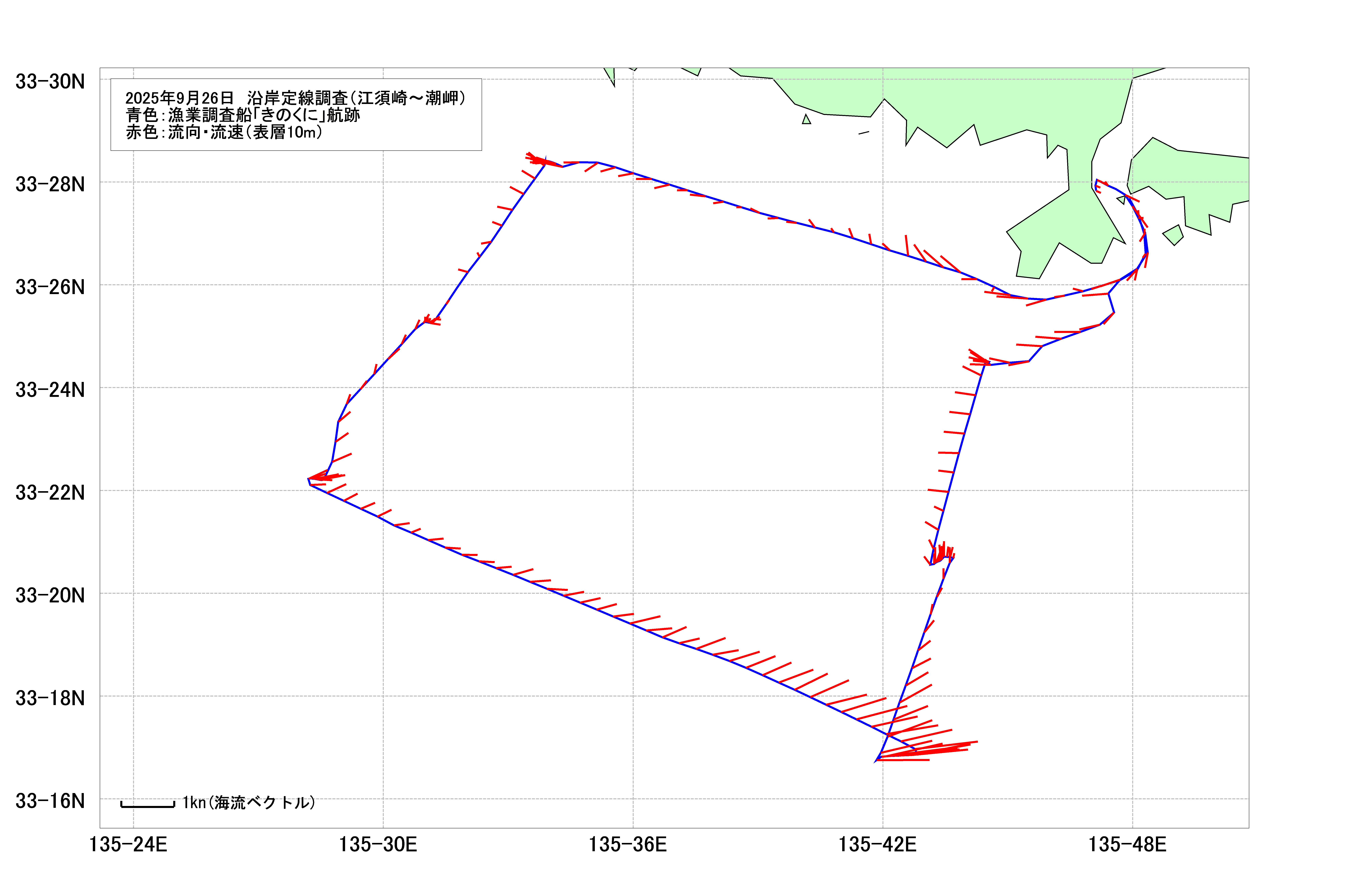 - 沿岸定線調査(江須埼沖~潮岬沖)(2025年9月26日) 海洋観測速報 海表面水温等温線図 調査船航跡・潮流図