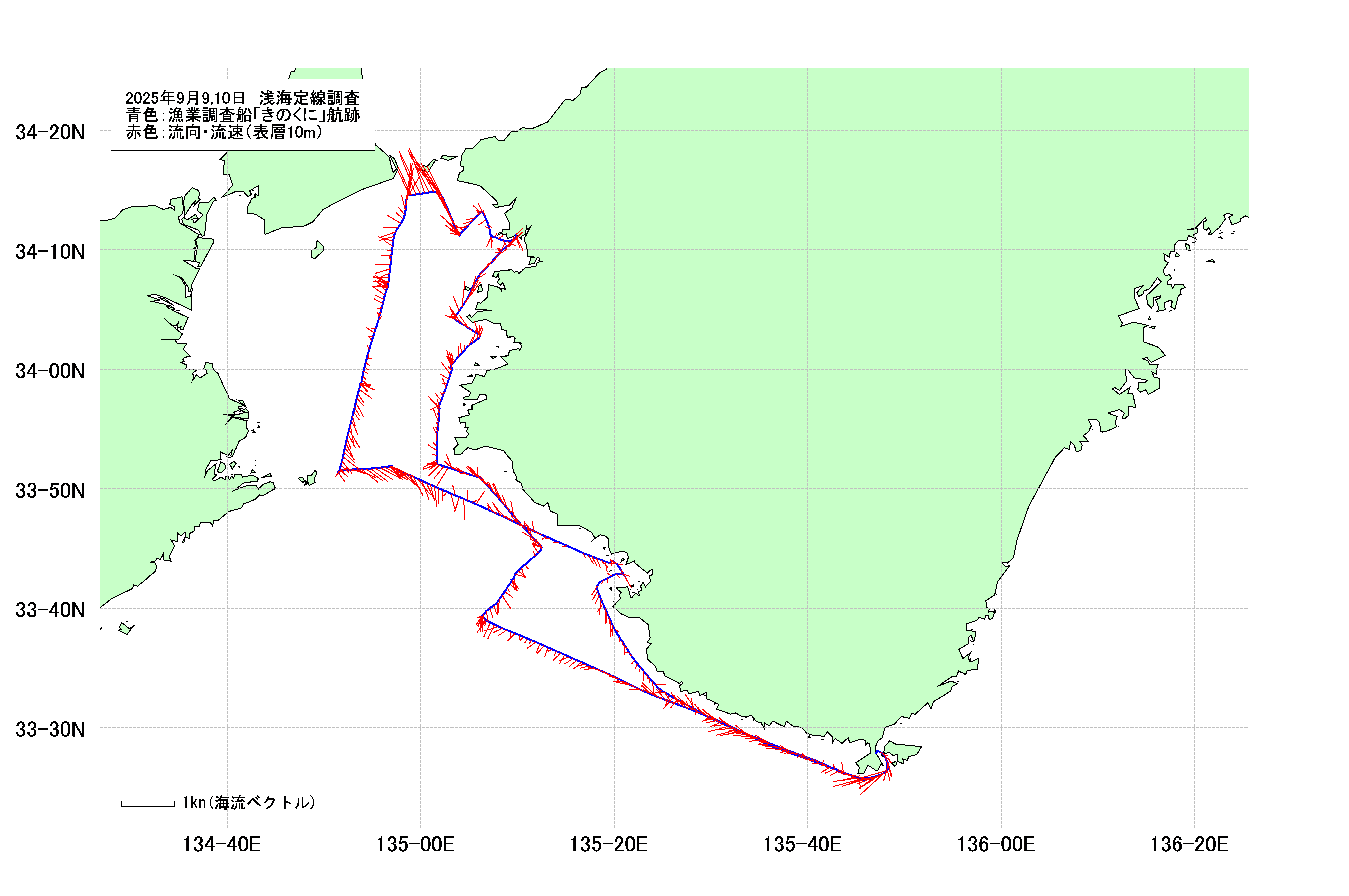 - 浅海定線調査(田倉埼沖~田辺湾)(2025年9月9日,10日) 海洋観測速報1 海洋観測速報2 海表面水温等温線図 調査船航跡・潮流図